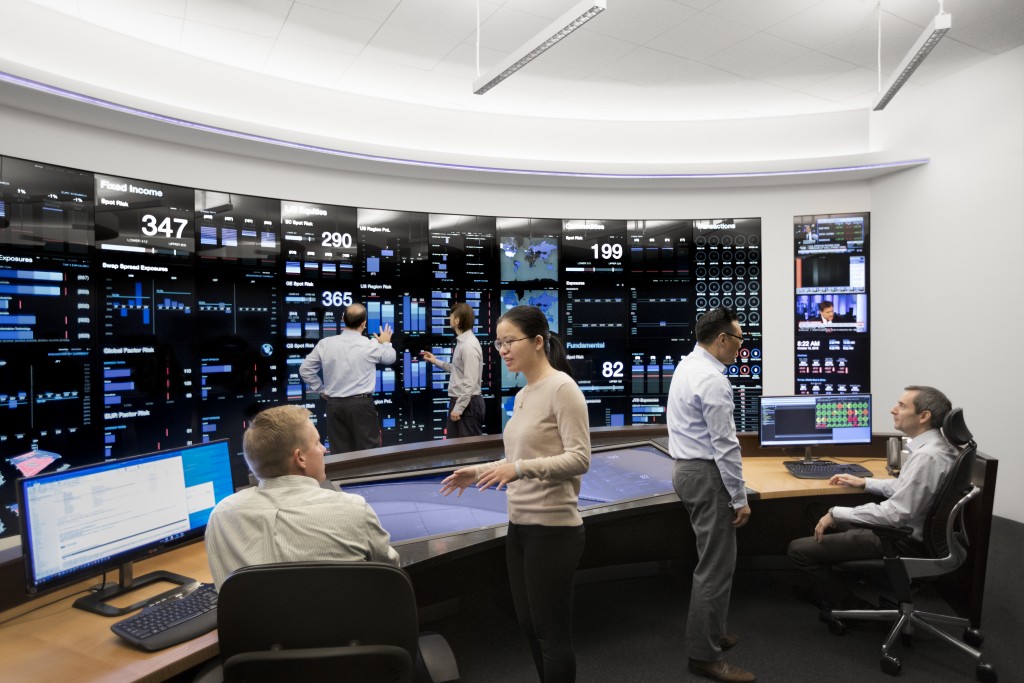 More Capital corp Risk Management Center provides a comprehensive view of the various investment portfolios and how they fit within pre-established guidelines. Built in 2014, its front-end consists of a 27’ by 8’ interactive touchscreen designed to visualize data in ways that allow for rapid comprehension. Its back-end systems, which connect to every More Capital corp office worldwide, continuously run a wide range of operational readiness, risk, and stress test monitors.